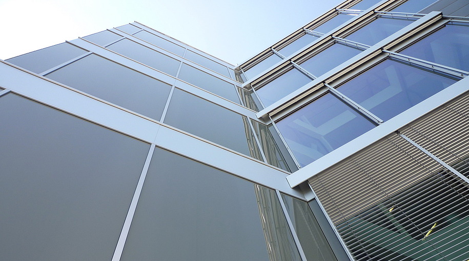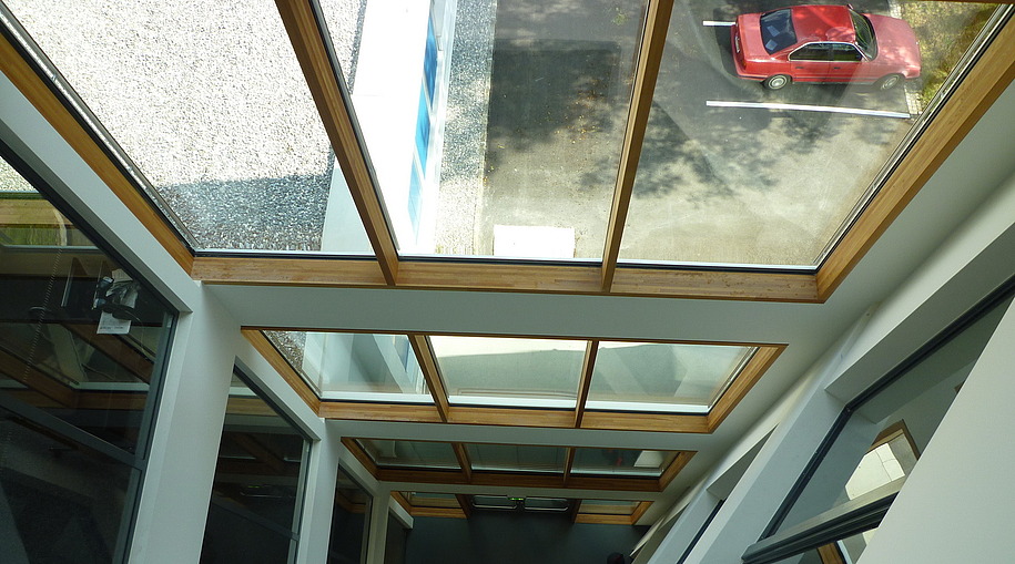 - Holzpfostenriegelfassade, LM-Aufsatzkonstruktion (1400m²), Einsatzdrehflügel, Türanlagen, EI30 Glasfassade (130m²)