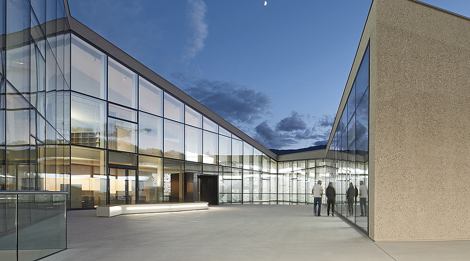- technische und wirtschaftliche Optimierung des Fassadenrasters und Variantenuntersuchungen, großformatige Verglasungen mit minimierter Unterkonstruktion, die Pfosten und Riegel werden punktuell an den Tragwerksstützen befestigt, die Anbindung erfolgt über justierbare Sonderhalter in Edelstahl, Lüftungsflügel als SG-Klappen nach außen öffnend, Türanlagen mit Stufenverglasung und mit Randemail überdecktem Profilsystem