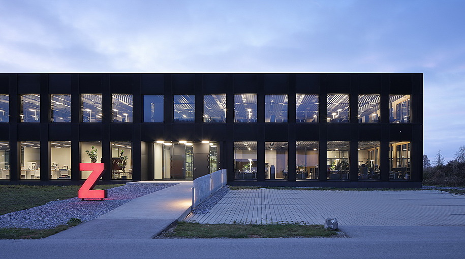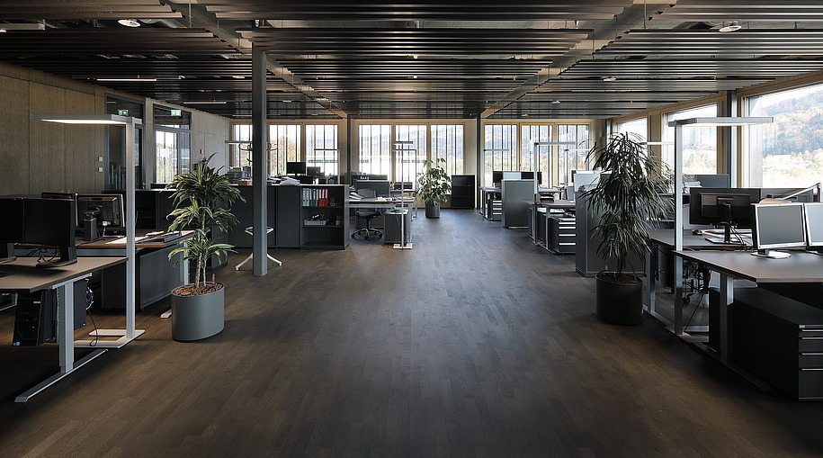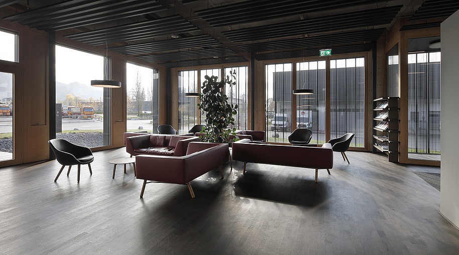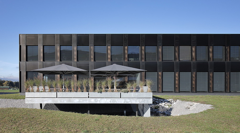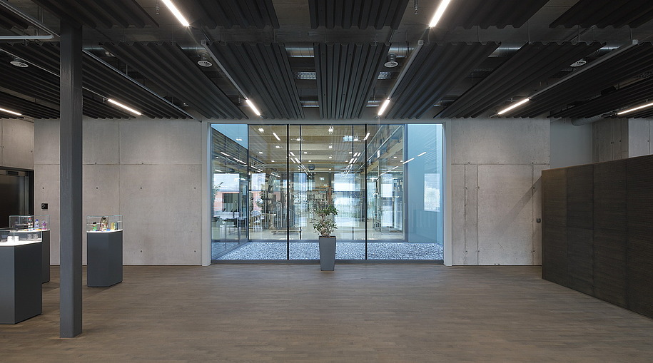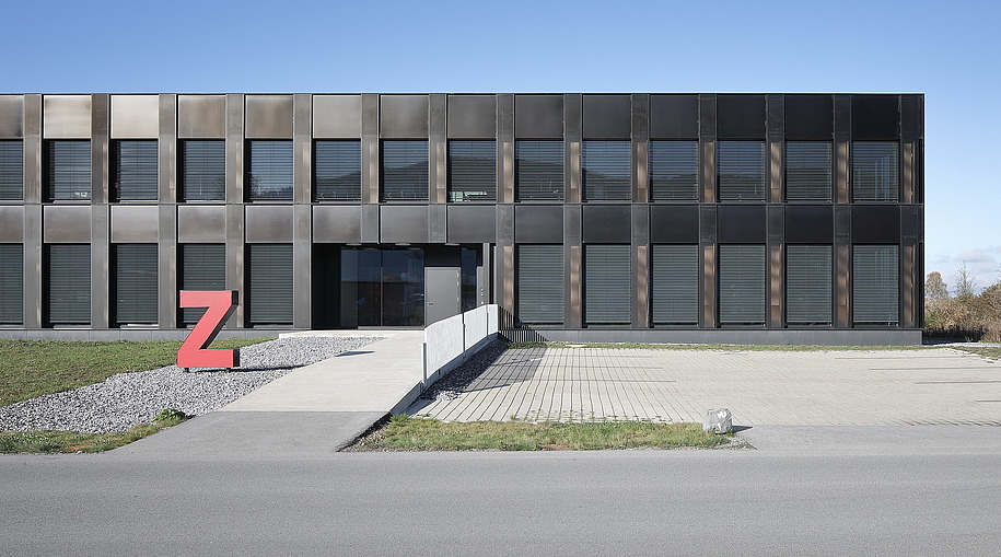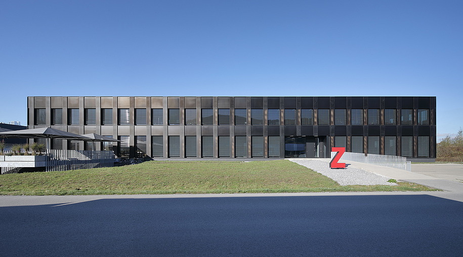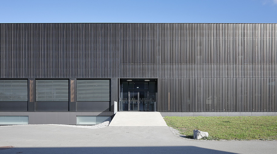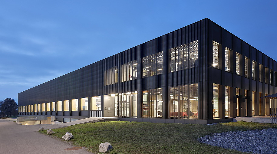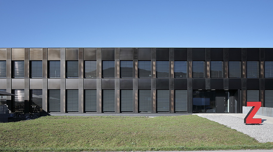 - Festverglasungen und Senkklappfenster in Holz, Brandschutzverglasungen, vorgehängte perforierte und geschlossene Trapezblechfassade, Sonnenschutzanlagen
